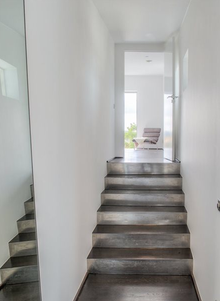Vacker svartlutad trappa mot en interiör helt i vitt.