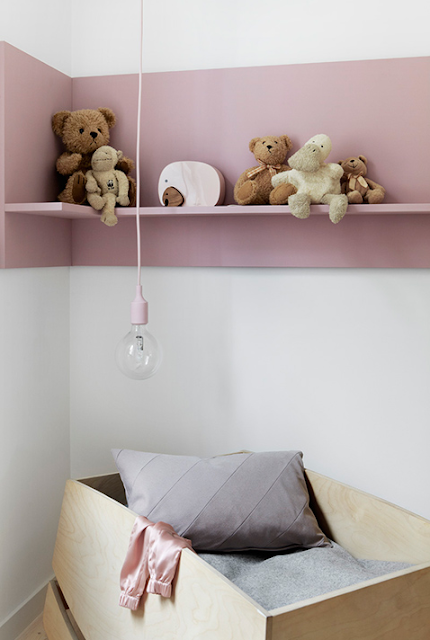 Fina lampan finns hos Muuto, och prydliga nallar på rad i en hylla som även fungerar nästan som tavla med sin ryggtavla i rosa.