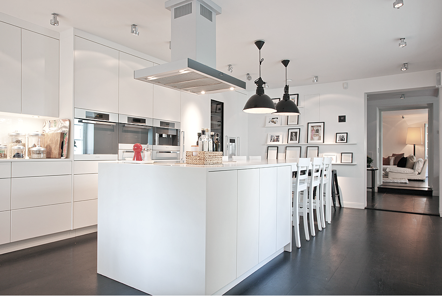 Ett modernt kök mot den i övrigt mer klassiska inredningen. Svarta vintage lampor som bryter av snyggt mot de plana vita luckorna. Och nu kommer jag på att jag skall köpa ett nytt Myrtenträd igen, de är ju så fina. Titta på spotarna i taket också, den som inte har takhöjd tillräckligt att bygga in spotarna (då får man ju sänka taket lite) kan lägga utanpåliggande spotar i taket, och dessa var riktigt snygga.