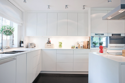 Och de moderna stommarna då? Jo, på denna bilden blir det tydligt vad jag menar, alla skåp avslutas mot en täcksida eller inbyggda lister. Ska man ha inbyggda spotar måste taket sänkas ca 10 cm, och vill du inte göra avkall på takhöjden får man välja en utanpåliggande spot. Varianten ovan är riktigt snygg och talar väl i detta formspråk stramt/funkis/modernt. Japp, det var dagen hittills, nu ska jag ta tag i söndagsprojekten i hemma! Trevlig söndag kära läsare :)